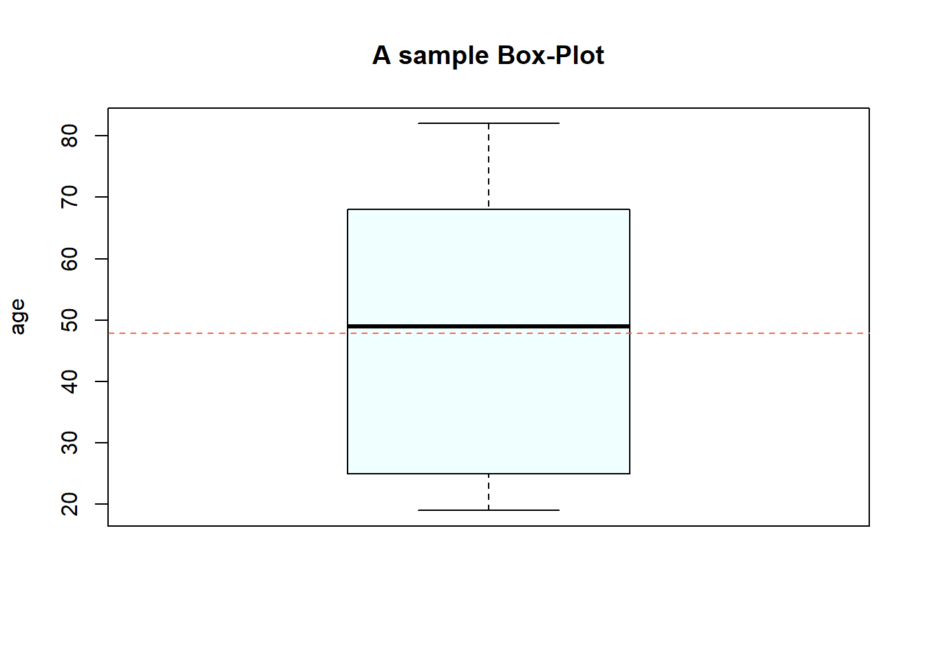 Yuqoridagi box-plot misoldagi dataframening age(yosh) ustuni(variable) uchun yaratilgan. Grafikda ko’rinib turganidek, ma’lumotlarning yarmi (50%) quti (IQR) ichida joylashgan, 25% quti yuqorisida va 25% quti ostida (grafikdagi quti tashqarisidagi nuqta-nuqta chiziqlar) joylashgan. Biz buni shunday talqin qilishimiz mumkin: respondentlarning/odamlarning 50 foizi 25 yoshdan 68 yoshgacha. O’rtadagi tekis chiziq mediana = 51, kesilgan chiziq esa o’rtacha arifmetik qiymat = taxminan 49 (o’rtacha arifmetik qiymatni grafikga qo’shish mumkin, lekin box-plotning tarkibiy/asosiy tasvirlaydigan o’lchamlariga kirmaydi), bundan kelib chiqib, so’rovda qatnashganlarning o’rtacha yoshi 50 yoshni tashkil qiladi degan xulosaga kelish mumkin. Respondentlarning 25 foizi 25 yoshgacha, 25 foizi 68 yoshdan yuqori, va qayd etilganidek, 50 foizi 25-68 yosh orasida.