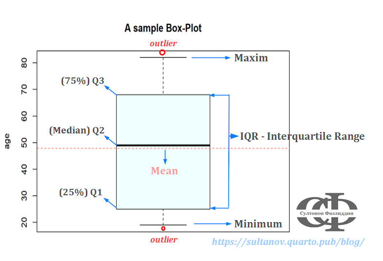 Tavsiflash tahlilini amalga oshirishda, ma’lumotlarning harakatlari haqida birinchi taassurot olish uchun, ayniqsa ma’lumotlar to’plami katta bo’lsa, ko’pincha grafik usullardan ham foydalananiladi. Eng kop qo’llanaliganlaridan bu box-plot dir. U ma’lumotlarni asosan 5 ta asosiy o’lchamga (\(x_{min}\), \(x_{0,25}\), \(x_{0,50}\), \(x_{0,75}\), \(x_{max}\)) jamlaydi va ularni grafik tarzda aks ettiradi. Quyida box-ploti tasvirlangan grafik keltirilgan.