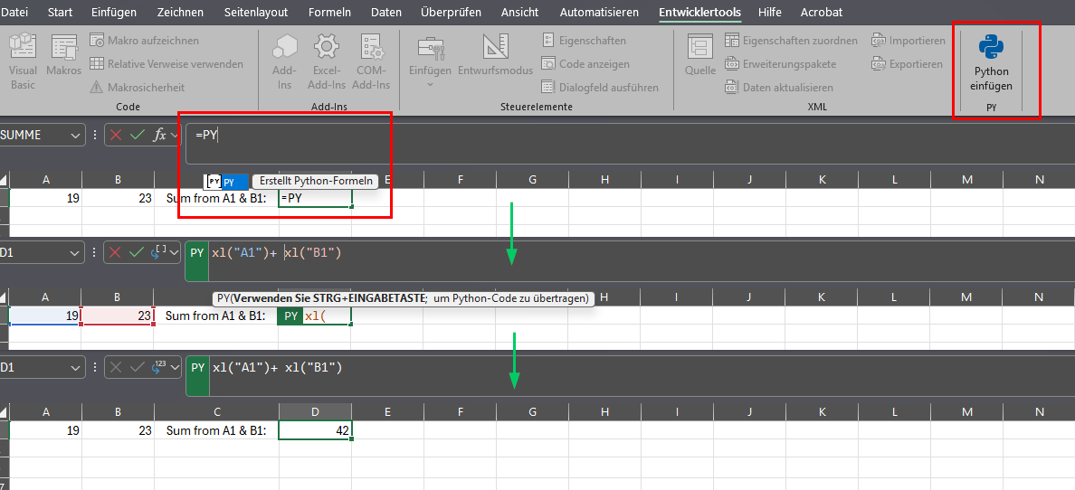 Um Python in Excel zu verwenden bzw. zu aktivieren, muss man eine Zelle auswählen, in die man die Formel mit Python schreiben will und klickt man auf der Registerkarte > Formeln > Python einfügenoder schreibt man in die Zelle =PY. Dann kann man Python - Code direkt in die Zelle schreiben. Im unten aufgeführten einfachen Beispiel werden die Werte in zwei Zellen (A1 und B1) summiert.