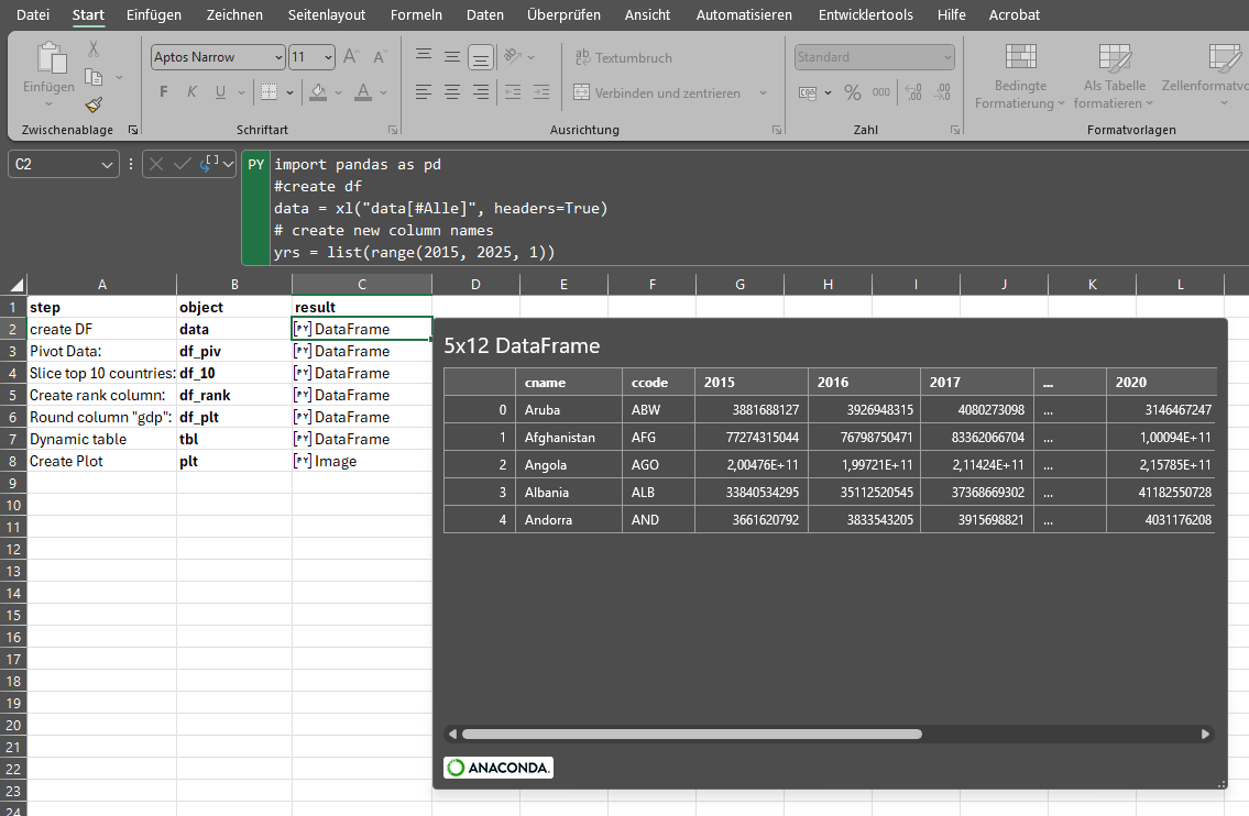 Tabellarische Daten werden in Büros weltweit am meisten in Tabellenkalkulationen bearbeitet und gespeichert. Bekannteste Software dafür ist Microsoft Excel. Ich bin neulich darauf gestoßen, dass man Python in Excel (ab Microsoft 365) verwenden kann. Und ich hab mir vorgenommen, etwas damit zu probieren. Ich habe ein kleiner dynamischer Bericht in Excel mit Python erstellt, in dem es sich um die zehn Länder weltweit mit dem höchsten BIP auf Basis der Kaufkraftparität handelt.